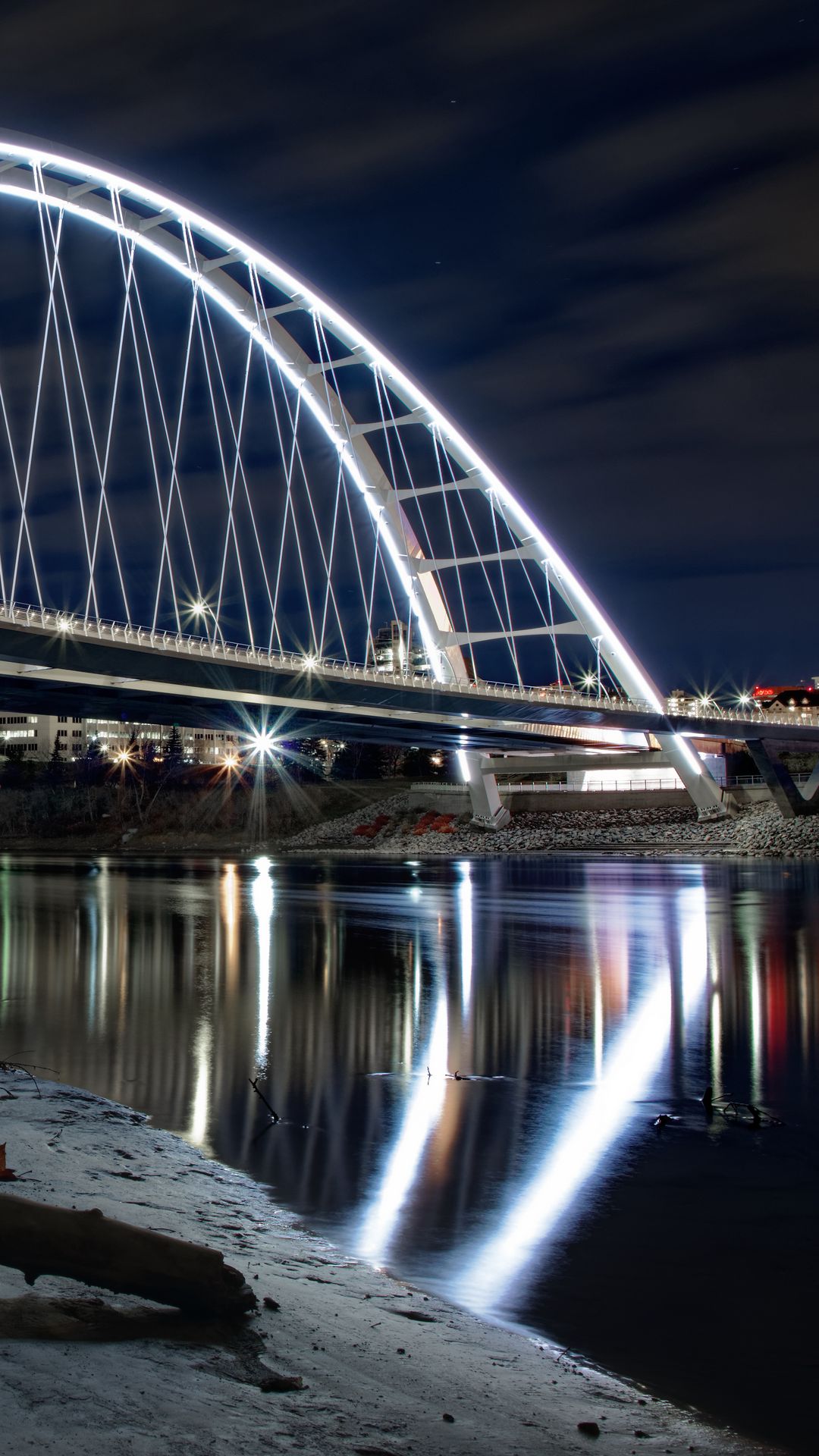 Description: Bridge, city, night, water, backlight, reflection, river, sand. Download free hd wallpaper and background image for Windows and Mac desktops, laptops, tablets and phones. Author: Κουράμπα License: CC BY-SA.