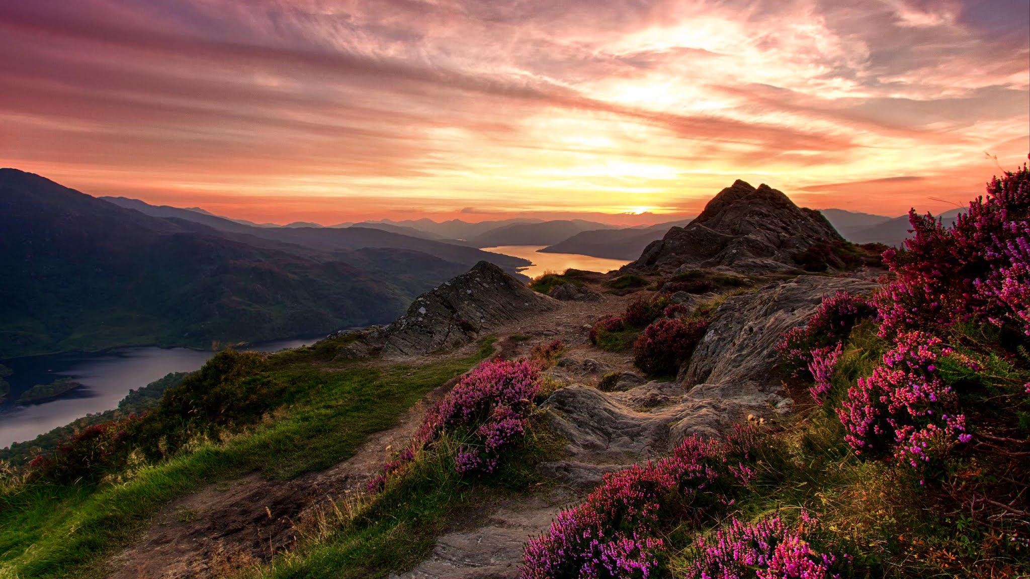 Description: Dreamy landscape, mountain, sunset, pink flowers, river, twilight sky clouds, sun, iphone skyline and desktop wallpaper. Download free nature hd wallpaper and background image for your windows and mac desktop, laptop, tablet and phone. Author: Andy Belsow License: CC BY.