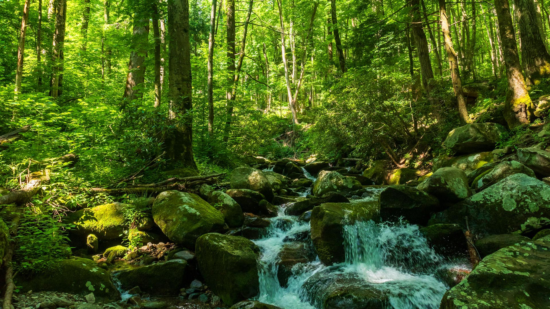 Description: Forest, trees, stream, stones, landscape, green desktop wallpaper. Download free nature hd wallpaper and background image for your Windows and Mac computer, laptop, tablet and phone. Author: Ben Cappellacci (flickr) License: CC BY.
