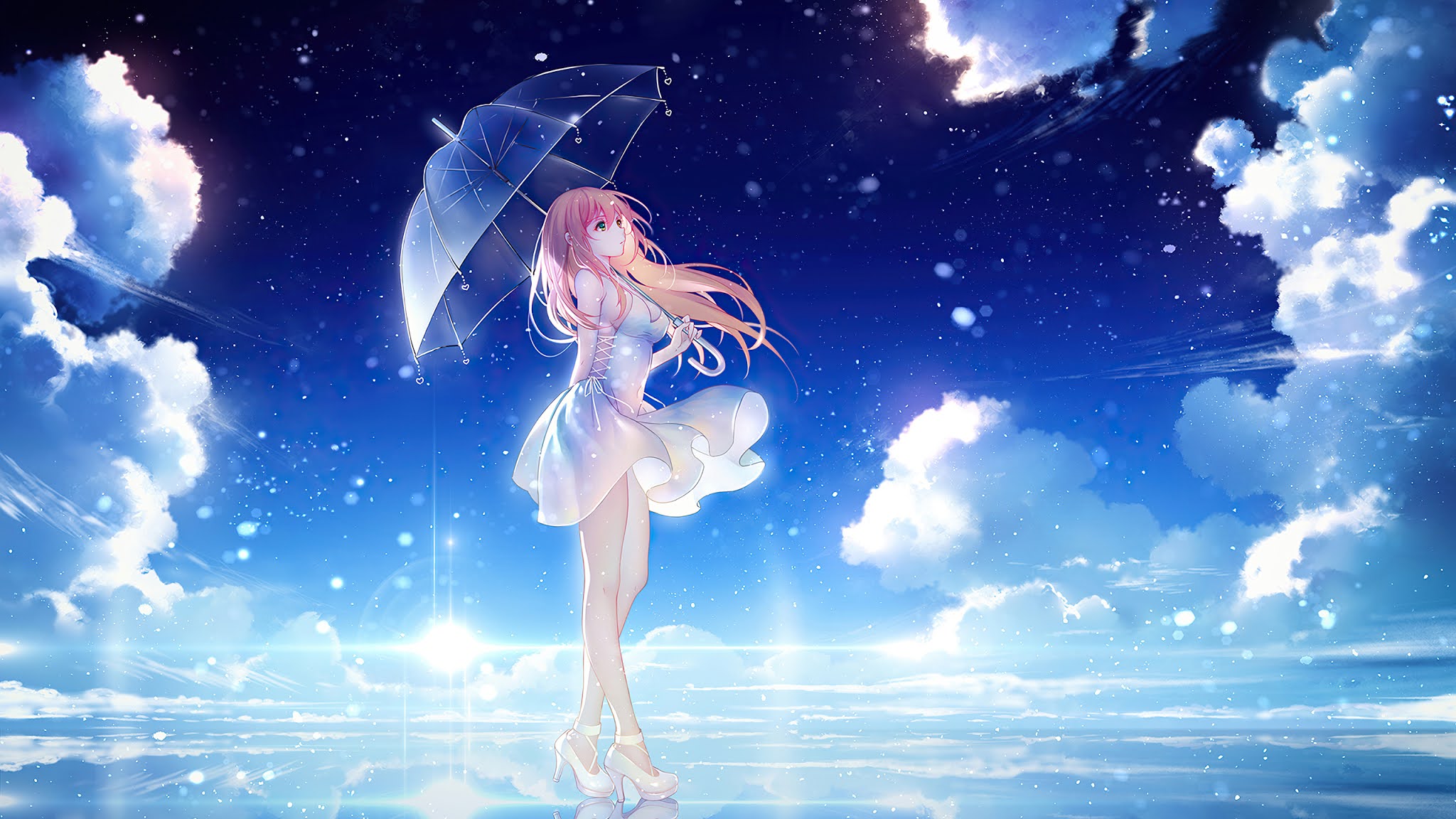 DescriptionWallpaper: Anime Girl Umbrella, Blue Sky, Clouds, Stars, White Dress. Download Free HD Wallpapers, Images, Backgrounds, Photos, & Pictures for Desktops, PCs, Windows, MAC, Laptops, Mobile Phones, Android, iPhone. License: Unlicensed.