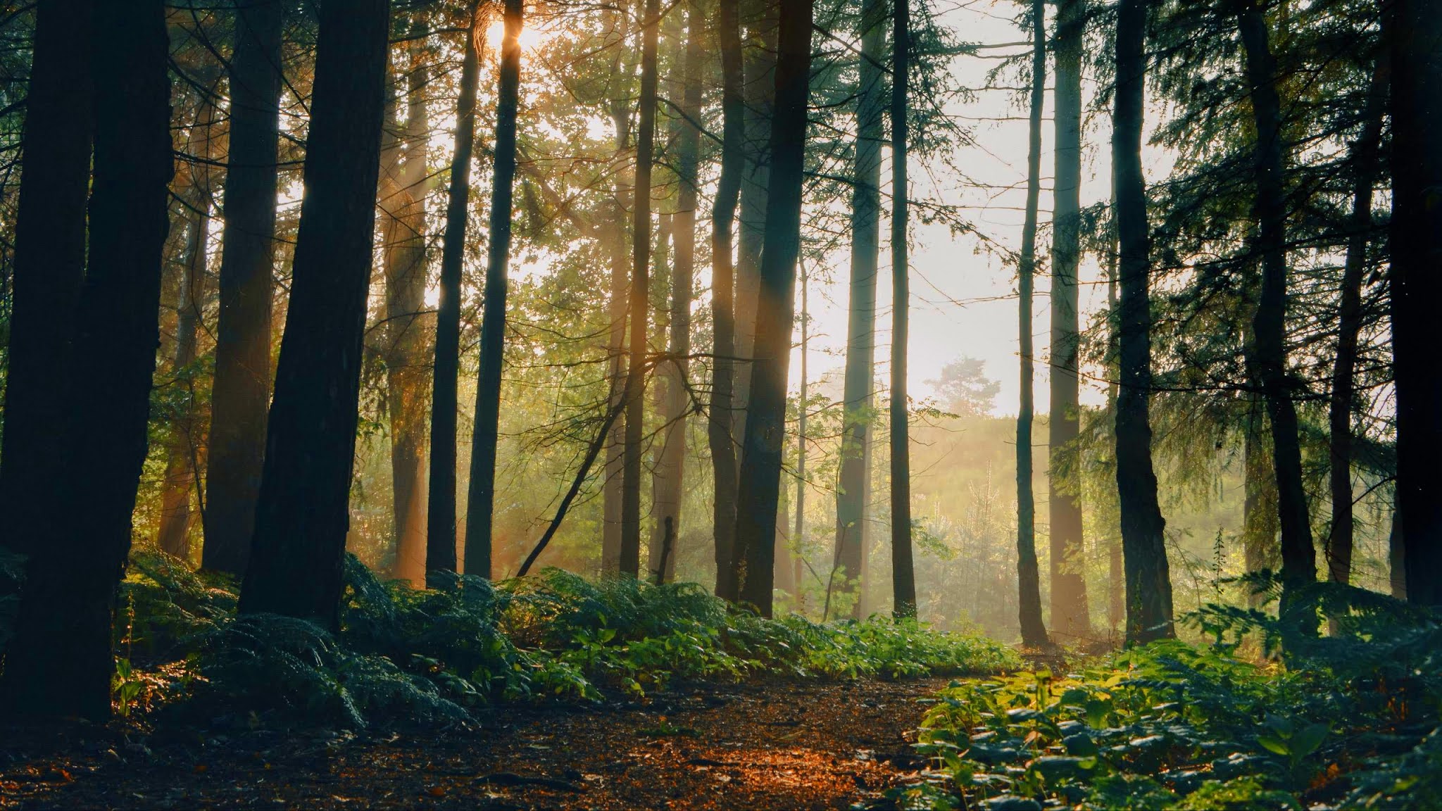 Description: Morning forest with sunlight, trees, path, fog, iphone landscape and desktop wallpaper. Download free nature hd wallpaper and background image for your windows and mac desktop, laptop, tablet and phone. Author: Ester van Dick License: CC BY-SA.
